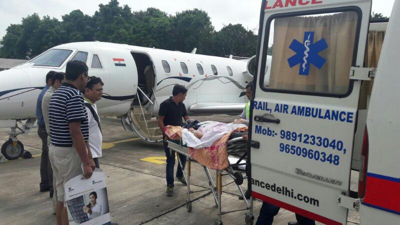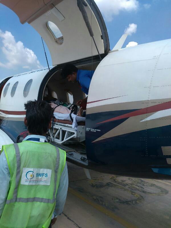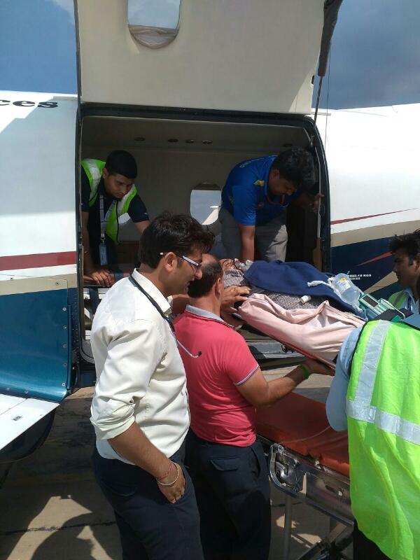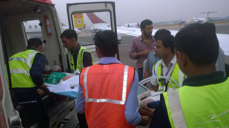 Step 1: The transportation process begins with the shifting of the patient from the road ambulance to the charter plane. Below is the image showing that how the patient is taken out of the road ambulance.